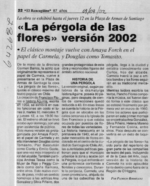 "La pérgola de las flores" versión 2002 [artículo] Patricio Rodríguez El Rancagüino (Rancagua) sept. 9, 2002, p. 22 .