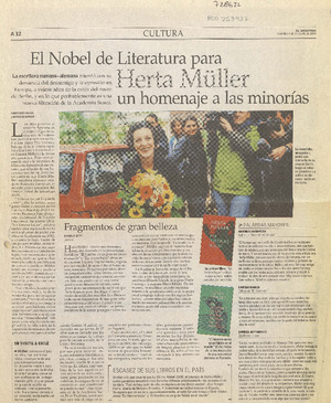 El Nobel de literatura para Herta Müller, un homenaje a las minorías [artículo] / Constanza Rojas y Maureen Lennon. El Mercurio (Diario : Santiago, Chile)-- oct. 9, 2009, p. A12. .