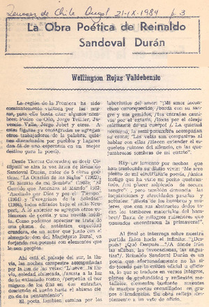 La obra poética de Reinaldo Sandoval Durán [artículo] / Wellington Rojas Valdebenito. Renacer de Chile (Angol, Chile)-- sept. 21, 1984, p. 3. .