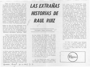 Las extrañas historias de Raúl Ruiz [artículo] / Wellington Rojas Valdebenito. Renacer. -- oct. 31, 1995, p. 3. El Divisadero. -- dic. 22, 1995, p. 1 y 4. .