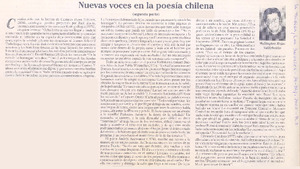 Nuevas voces en la poesía chilena (segunda parte) [artículo] / Wellington Rojas Valdebenito. La Tribuna (diario : Los Angeles, Chile)-- mayo 31, 2005, p. 3. El Heraldo (diario : Linares, Chile)-- jul. 30, 2005, p. 2. .