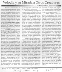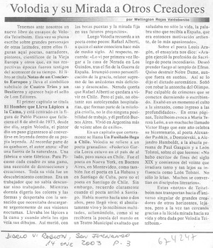 Volodia y su mirada a otros creadores [artículo] / Wellington Rojas Valdebenito. Diario VI Región (San Fernando, Chile)-- ene. 14, 2003, p. 3. .