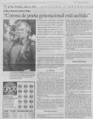 "Corona de poeta generacional está acéfala" [artículo] Marcelo Sánchez Rojel El Sur (diario : Concepción, Chile)-- nov. 29, 1999, p. 14 retr. .