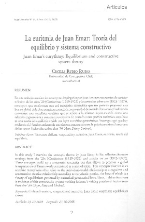 La euritmia de Juan Emar [artículo] / Cecilia Rubio Rubio. Acta Literaria (revista : Concepción, Chile)-- no. 37 (2008) p. 9-23. .