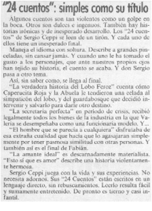 "24 Cuentos": simples como su título [artículo] / María Celeste Ruíz de Gamboa. Las Últimas Noticias (Diario : Santiago, Chile)-- ene. 22, 1985, p. 12. .