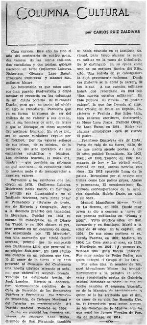 Columna cultural [artículo] / Carlos Ruiz Zaldivar. El Trabajo (San Felipe, Chile)-- oct. 28, 1978, p. 3. .