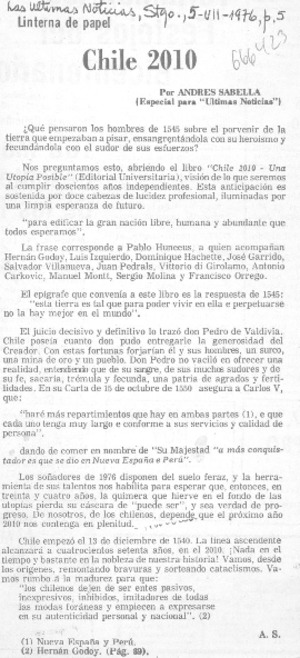 Chile 2010 [artículo] / Andrés Sabella. Las Últimas Noricias (Diario : Santiago, Chile)-- jul. 5, 1976, p. 5. .