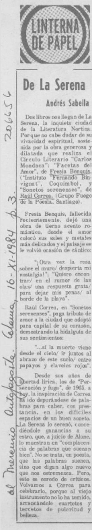 De La Serena [artículo] / Andrés Sabella. El Mercurio (Antofagasta). -- nov. 16, 1984, p. 3. El Mercurio (Calama). -- nov. 16, 1984, p. 3. .