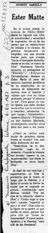 Ester Matte [artículo] / Andrés Sabella. El Mercurio (Antofagasta). -- dic. 6, 1987, p. 3. El Mercurio (Calama). -- dic. 6, 1987, p. 3. .