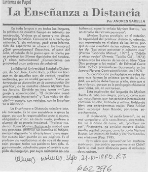 La enseñanza a distancia [artículo] / Andrés Sabella. Las Últimas Noticias (Diario : Santiago, Chile)-- jun. 21, 1980, p. 7. .