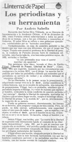 Los periodistas y su herramienta [artículo] / Andrés Sabella. El Mercurio (Antofagasta, Chile)-- ago. 17, 1979, p. 3. La Prensa (Tocopilla, Chile)-- ago. 17, 1979, p. 3. .