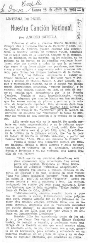 Nuestra canción nacional [artículo] / Andrés Sabella. La Prensa (Tocopilla, Chile)-- abr. 15, 1974, p. 3. .