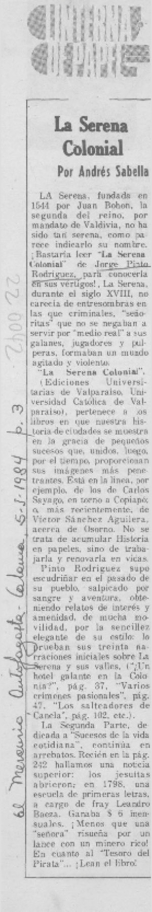"La Serena colonial" [artículo] / Andrés Sabella. El Mercurio (Antofagasta). -- ene. 5, 1984, p. 3. El Mercurio (Calama). -- ene. 5, 1984, p. 3. .