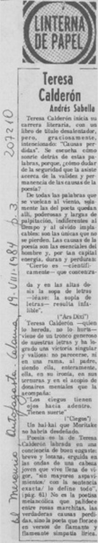 Teresa Calderón [artículo] / Andrés Sabella. El Mercurio (Antofagasta). -- ago. 19, 1984, p. 3. El Mercurio (Calama). -- ago. 19, 1984, p. 3. .