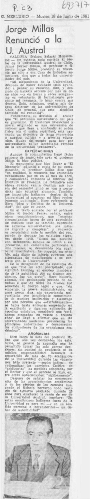 Jorge Millas renunció a la U. Austral [artículo] / Nelson Salazar Monasterio. El Mercurio (Diario : Santiago, Chile)-- jun. 16, 1981, p. C3. retr. .