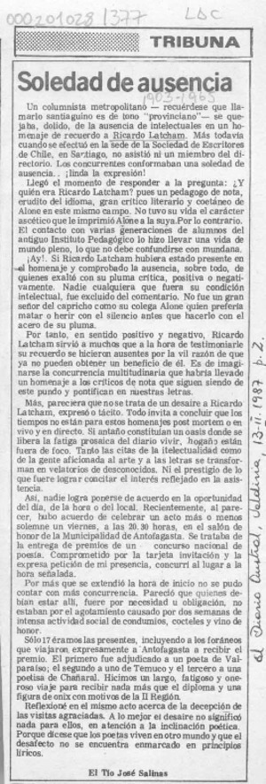 Soledad de ausencia [artículo] / El tío José Salinas. El Diario Austral (Valdivia). -- feb. 13, 1987, p. 2. .