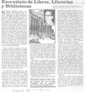 Escrutinio de libros, librerías y bibliotecas [artículo] / Manuel Salvat Monguillot. La Segunda (Diario : Santiago, Chile)-- feb. 11, 1983, p. 6. retr. .
