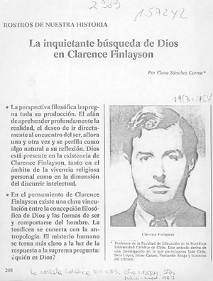 La inquietante búsqueda de Dios en Clarence Finlayson [artículo] / Elena Sánchez Correa. La Revista Católica. -- no. 1075 (jul. sept. 1987) p. 208-215 retr. .