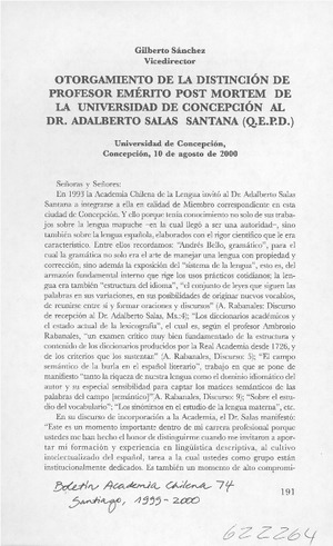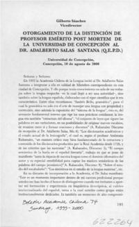 Otorgamiento de la distinción de profesor emérito post mortem de la Universidad de Concepción al Dr. Adalberto Salas Santana (Q.E.P.D.) [artículo] Gilberto Sánchez Boletín Academia Chilena (Santiago) no. 74 (1999-2000) p. 191-192 .