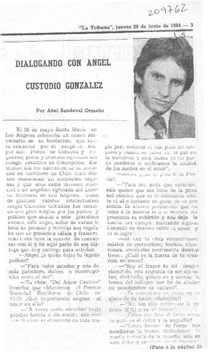 Dialogando con Angel Custodio González [artículo] / Abel Sandoval Ormeño. La Tribuna. -- jun. 28, 1984, p. 3 y 5. retr. .