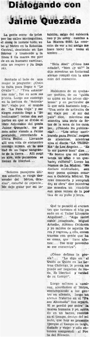 Dialogando con Jaime Quezada [artículo] / Abel Sandoval. La Tribuna (Los Angeles, Chile)-- jun. 23, 1979, p. 5. .
