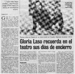 Gloria Laso recuerda en el teatro sus días de encierro [artículo] / Marietta Santi. Las Últimas Noticias (Diario : Santiago, Chile)-- nov. 4, 2001, p. 40. retr. .