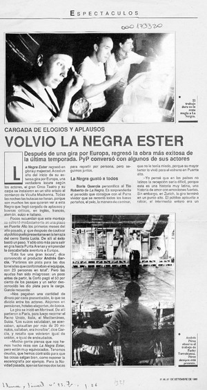 Volvió la negra Ester [artículo] / Marietta Santi. Pluma y Pincel. -- no. 93 (sept. 21, 1989) p. 26-27 retr. .