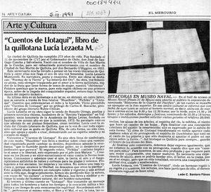 "Cuentos de Llotaqui", libro de la quillotana Lucía Lezaeta M. [artículo] / León C. Santoro Funes. El Mercurio (Valparaíso). -- mar. 5, 1991, p. 16 .