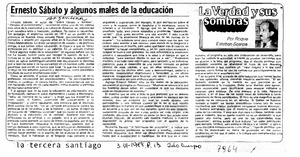 Ernesto Sábato y algunos males de la educación [artículo] / Roque Esteban Scarpa. La Tercera de La Hora (Diario : Santiago, Chile)-- jun. 3, 1984, p. 13. retr. .