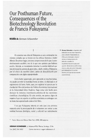 Our Posthuman future, consequences of the biotechnology revolution de Francis Fukuyama [artículo] / Herman Schwember. Perspectivas (Santiago, Chile)-- no. 1 (2002) p. 159-164. .