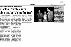 Carlos Fuentes será declarado "visita ilustre" [artículo]. La Tercera. -- dic. 3, 1993, p. 15 .
