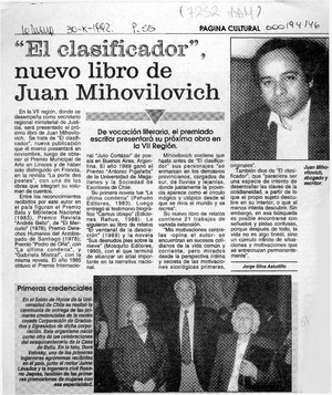 "El clasificador", nuevo libro de Juan Mihovilovich [artículo] / Jorge Silva Astudillo. La Tercera. -- oct. 30, 1992, p. 55 retr. .