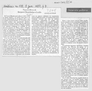 Nuevos libros de Jacques Chonchol en el exilio [artículo] / Julio Silva Solar. Análisis. -- no. 178 (jun. 8, 1987) p. 7. .