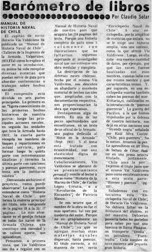 Manual de historia naval de Chile [artículo] / Claudio Solar. La Estrella (Valparaíso, Chile)-- ene. 20, 1973, p. 26. .