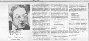 Raúl Correa, poeta serenense [artículo] / Hernán del Solar. El Mercurio (Santiago, Chile)-- jul. 22, 1979, p. E2. retr. .