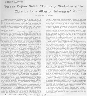 Teresa Cajiao Salas, "temas y símbolos en la obra de Luis Alberto Heiremans" [artículo] / Hernán del Solar. El Mercurio (Diario : Santiago, Chile)-- abr. 11, 1971, p. 2. .