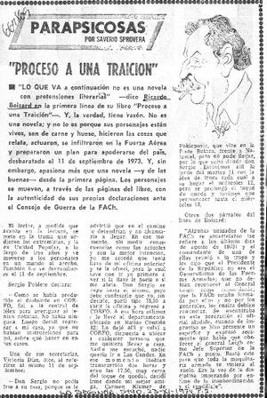 Proceso a una traición" [artículo] / Saverio Sprovera. La Segunda (Diario : Santiago, Chile)-- nov. 23, 1974, p. 2. .