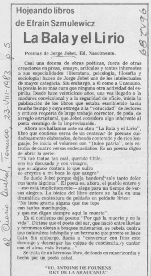 La bala y el lirio [artículo] / Efraín Szmulewicz. El Diario Austral (Temuco, Chile)-- ago. 23, 1983, p. 5. .