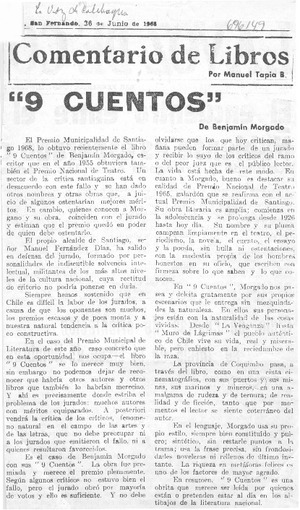 "9 cuentos" [artículo] / Manuel Tapia B. La Voz de Colchagua (San Fernando, Chile)-- jun. 26, 1968. .