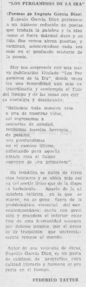 "Los pergaminos de la ira" [artículo] / Federico Tatter. La Prensa (Curicó). -- jul. 8, 1984, p. 4. La Discusión. -- jul. 11, 1984, p. 2. .