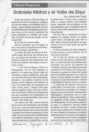 Gabriela Mistral y el valle de Elqui [artículo] / María Inés Taulis. Atacama. -- abr. 8, 1992, p. 5. .