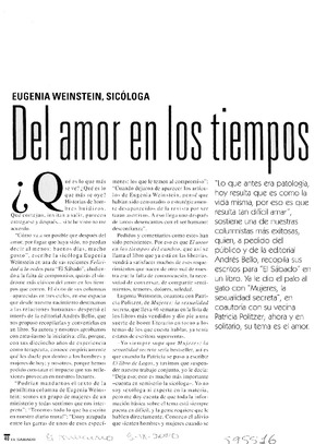 Del amor en los tiempos del cambio [artículo] Ximena Torres Cautivo El Mercurio (Santiago) sept. 9, 2000, p. 40-43 (suplemento "El Sábado") retr. .