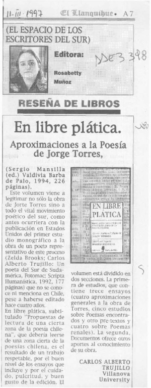 En libre plática [artículo] / Carlos Alberto Trujillo. El Llanquihue (diario : Puerto Montt, Chile)-- mar. 11, 1997, p. A7 il. .