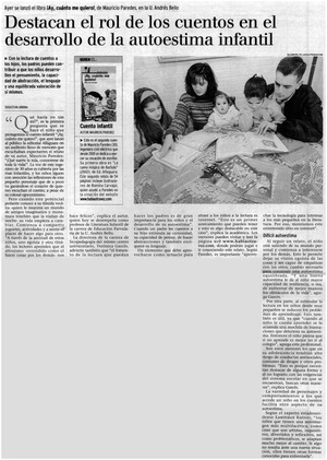 Destacan el rol de los cuentos en el desarrollo de la autoestima infantil [artículo] / Sebastián Urbina. La Tercera (Diario : Santiago, Chile)-- oct. 16, 2003, p. 23. il. .
