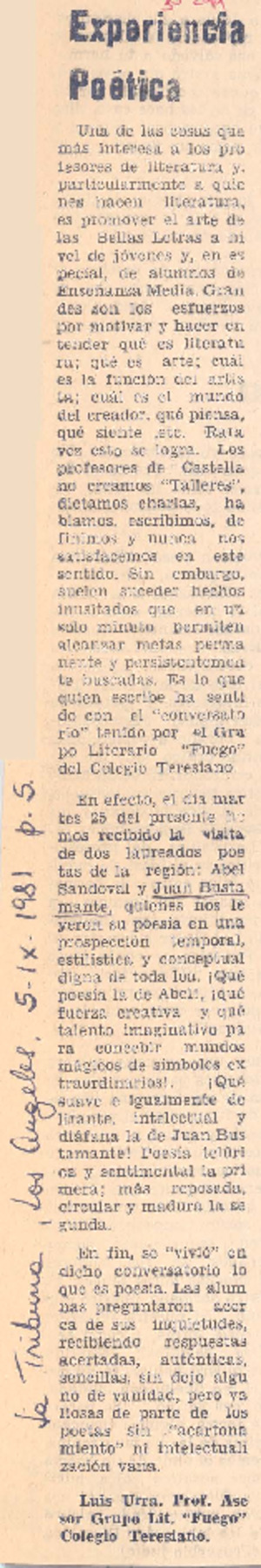 Experiencia poética [artículo] / Luis Urra. La Tribuna (Los Angeles, Chile)-- sept. 5, 1981, p. 5. .