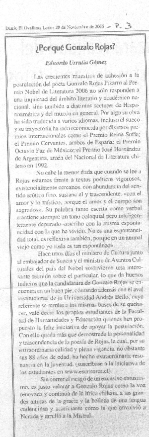 ¿Por qué Gonzalo Rojas? [artículo] Eduardo Urrutia Gómez Diario El Ovallino (Diario: Ovalle, Chile)-- nov. 28, 2005, p. 3 .