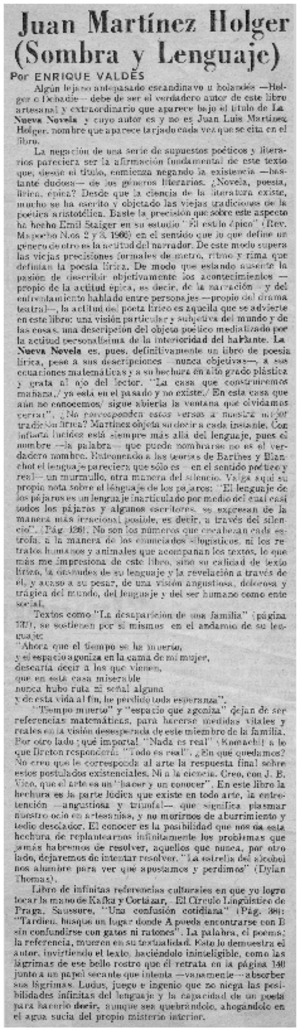 Juan Martínez Holger (sombra y lenguaje) [artículo] Enrique Valdés.