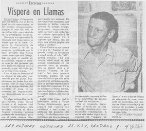 Vísperas en llamas [artículo] / Juan Rubén Valenzuela. Las Últimas Noticias (Diario : Santiago, Chile)-- oct. 27, 1974, p. 4. retr. .