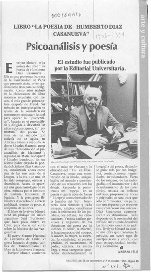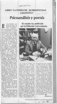 Psicoanálisis y poesía [artículo] / Mariana Véliz. Análisis. -- no. 246 (sept. 26, 1988) p. 45 retr. .