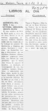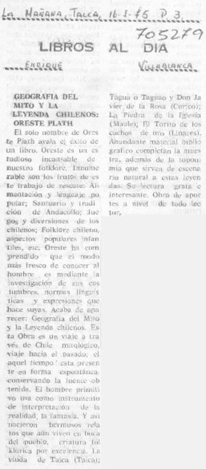 Geografía del mito y la leyenda chilenos [artículo] / Enrique Villablanca. La Mañana (Talca, Chile)-- ene. 16, 1975, p. 3. .
